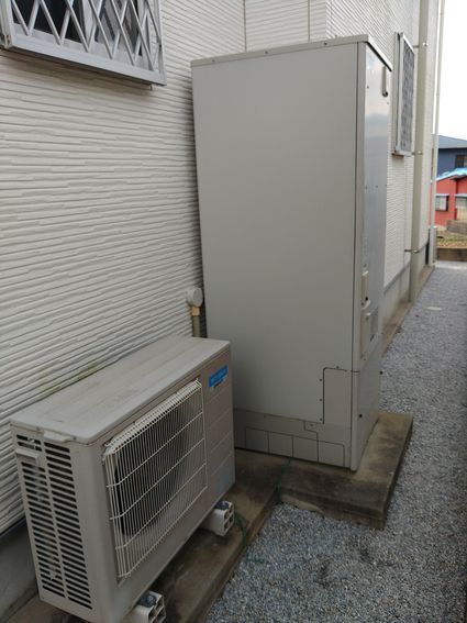 取替前と取替後のエコキュートの形状が変わったため、エコキュート本体とヒートポンプユニットを、少し離しての設置となりました。