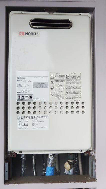 以前のノーリツ製の給湯器 GQ-1627AWX から、現行のノーリツ製の給湯器 GQ-1627AWX-DX BL への取替でした。