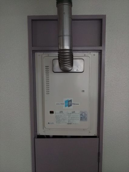 パロマ製の給湯器同士の取替でしたが、給湯器本体のサイズが変わっていたため、パイプスペースへの取付枠も一緒に取り替えました。