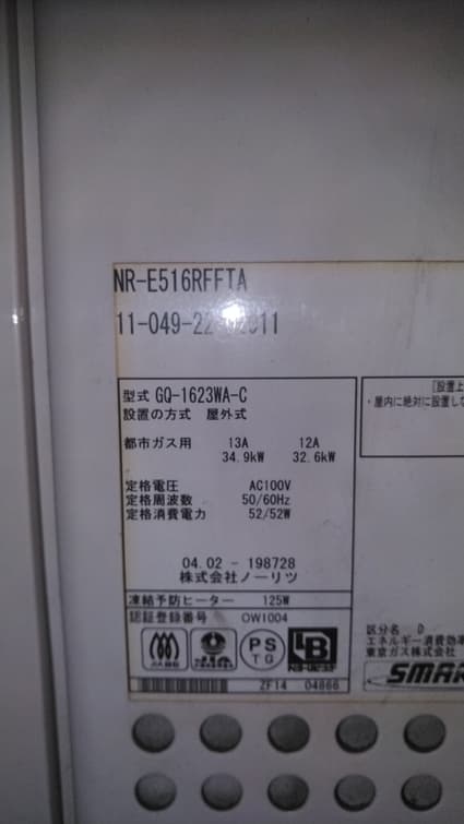 既設の給湯器から、リンナイ製の給湯器 RUX-V1615SFFBA(A)-E への取替でした。