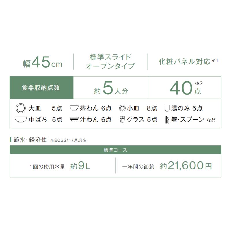 | 食器収納点数 | 40点 大皿: 5点 茶わん: 6点 小皿: 8点 湯のみ: 5点 中ばち: 5点 汁わん: 6点 グラス: 5点 箸・スプーンなど |