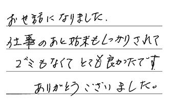 お世話になりました。仕事のあと始末もしっかりされて、ゴミもなくて、とても良かったです。ありがとうございました。