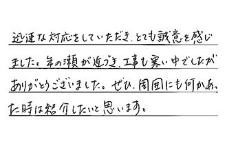 迅速な対応をしていただき、とても誠意を感じました。年の瀬が近づき、工事も寒い中でしたが、ありがとうございました。ぜひ、周囲にも何かあった時は、紹介したいと思います。