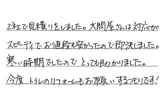 2社で見積りをしました。大問屋さんは対応がスピーディで、お値段も安かったので即決しました。寒い時期でしたので、とっても助かりました。今度、トイレのリフォームもお願いするつもりです!
