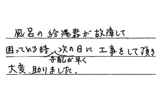 風呂の給湯器が故障して困っている時、手配が早く、次の日に工事をして頂き、大変助かりました。