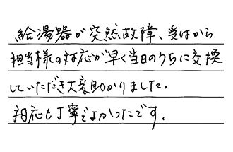 給湯器が突然故障、受付から担当様の対応が早く、当日のうちに交換していただき、大変助かりました。対応も丁寧でよかったです。
