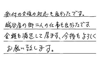 受付の女性の対応も良かったです。越谷店の御二人の仕事も良かったです。金額も満足して居ます。今後もよろしくお願い致します。