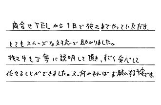 問合せTELから1日で施工までやっていただき、とてもスムーズな対応で助かりました。施工中も丁寧に説明して頂き、すごく安心して任せることができました。又、何かあれば、お願いする予定です。
