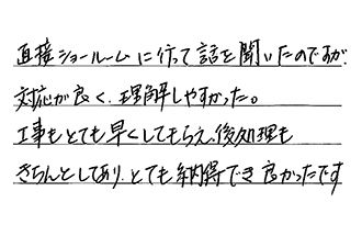 直接ショールームに行って話を聞いたのですが、対応が良く、理解しやすかった。工事もとても早くしてもらえ、後処理もきちんとしてあり、とても納得でき、良かったです。