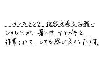 トイレのタンク・便器交換をお願いしましたが、暑い中テキパキと作業されて、とても感じ良かったです。