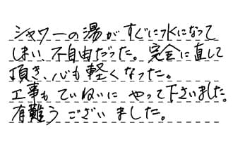 シャワーの湯がすぐに水になってしまい、不自由だった。完全に直して頂き、心も軽くなった。工事も丁寧にやって下さいました。有難うございました。