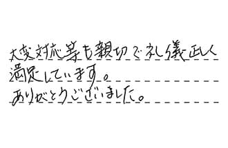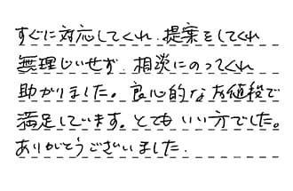 すぐに対応してくれ、提案をしてくれ無理じいせず、相談にのってくれ助かりました。良心的なお値段で満足しています。とてもいい方でした。ありがとうございました。