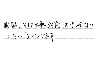 電話してから施工迄のスピードが早くてよかったです。満足しています。他社で見積りは取りませんでしたが、値段には満足しています。