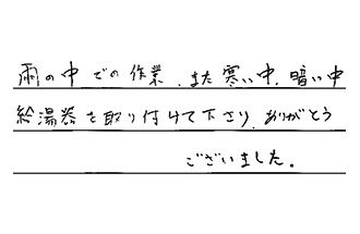 雨の中での作業、また寒い中、暗い中、給湯器を取り付けて下さり、ありがとうございました。