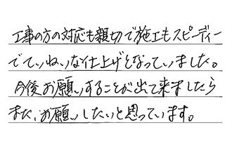 工事の方の対応も親切で、施工もスピーディーで、ていねいな仕上げとなっていました。今後お願いすることが出て来ましたら、また、お願いしたいと思っています。
