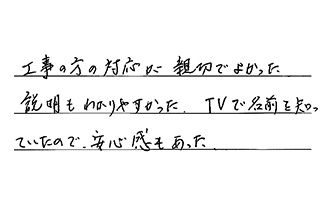受付、見積、工事、全ての対応が好印象でした。また何かあったら、是非お願いしたいと思います。