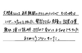 大問屋さんは、毎月新聞にチラシが入るので、もしもの時はここで…、とチェックしてきました。電話対応、見積り、設置作業、親切・丁寧な説明・対応で、安心しておまかせできました。ありがとうございました。