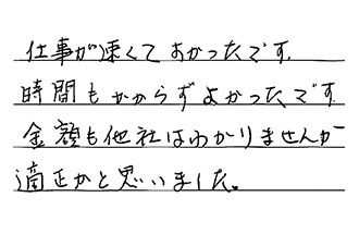 仕事が速くてよかったです。時間もかからずよかったです。金額も他社はわかりませんが、適正かと思いました。