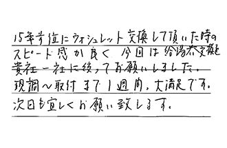 15年前位に、ウォシュレット交換して頂いた時のスピード感が良く、今回は、給湯器交換を、貴社一社に絞ってお願いしました。現調~取付まで1週間、大満足です。次回も宜しくお願い致します。