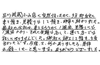 品川武蔵小山店に突然伺ったのに、夕方、即自宅に来て頂き、見積りもして頂き、非常に助かりました。最初の会社は、来てもらうのに1週間、見積りにも1週間かかり、それに金額も高くて、遅くて高いでは話しになりませんでした。御社に施工して頂き、大変良かったです。今後、又、何かありましたら、是非お願いしたいと思います。ありがとうございました。
