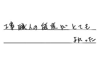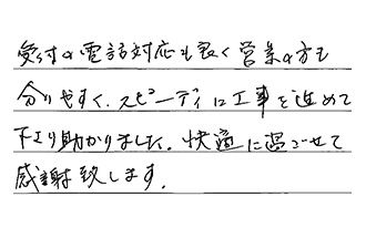 受付の電話対応も良く、営業の方も分かりやすく、スピーディーに工事を進めて下さり、助かりました。快適に過ごせて、感謝致します。