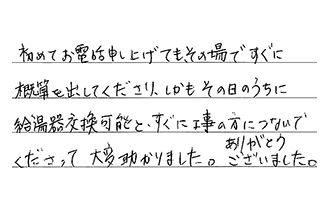 初めてお電話申し上げても、その場ですぐに概算を出してくださり、しかもその日のうちに給湯器交換可能と、すぐに工事の方につないでくださって、大変助かりました。ありがとうございました。