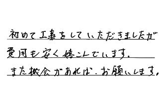 初めて工事をしていただいたが、手早く感じよく満足しています。ありがとうございました。又、何かありましたら、お願いします。
