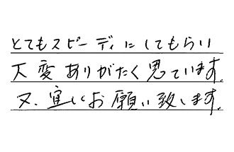 とてもスピーディにしてもらい、大変ありがたく思っています。又、宜しくお願い致します。