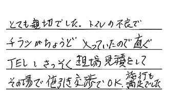 とても親切でした。トイレの不良で、チラシがちょうど入っていたので、直ぐTELし、さっそく現場見積をして、その場で値引き交渉でOK。施工も満足でした。