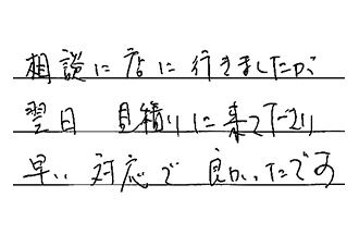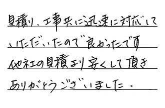 見積り、工事共に迅速に対応していただいたので、良かったです。他社の見積より安くして頂き、ありがとうございました。
