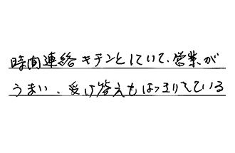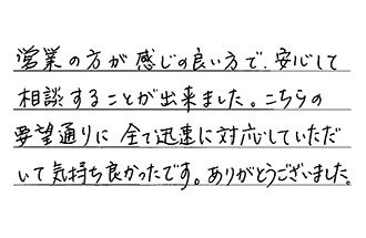 営業の方が感じの良い方で、安心して相談することが出来ました。こちらの要望通りに、全て迅速に対応していただいて、気持ち良かったです。ありがとうございました。