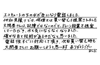 エコキュートの下の水が気になり、電話しました。他社見積りでは、修理又は買い替えを提案されました。大問屋さんは、故障ではないのでと、ドレーン設置を提案していただき、水も気にならなくなりました。確かな目と技術があるのだなと思いました。電話後すぐに対応して頂き、次回買い替え時も、大問屋さんにお願いしようと思います。ありがとうございました。