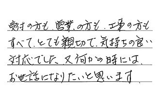 受付の方も、営業の方も、工事の方も、すべてとても親切で、気持ちの良い対応でした。又、何かの時には、お世話になりたいと思います。