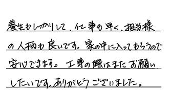 養生もしっかりして、仕事も早く、担当様の人柄も良いです。家の中に入ってもらうので、安心できます。工事の際は、またお願いしたいです。ありがとうございました。