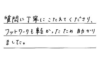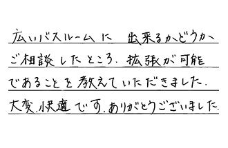 見積りの時点から最安値に協力的で、対応も親切・丁寧で、安心してお任せできました。補助金制度についても、はじめからご案内下さいまして、気になっていた箇所のリフォームも、一度にできました。ありがとうございました。