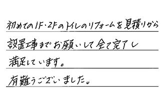 初めての1F・2Fのトイレのリフォームを見積りから設置工事までお願いして、全て完了し、満足しています。有難うございました。