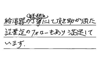 お湯が出なくなって困っていたところ、見積りの翌日に工事してもらい、早い対応で助かりました。2日間、同じ2名の方が、説明もわかりやすく、感じのいい対応でした。暑いなか、ありがとうございました。