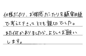 仕様だったり、お得感だったりを顧客目線で考えて下さって、とても親切でした。また何かありましたら、よろしくお願いします。