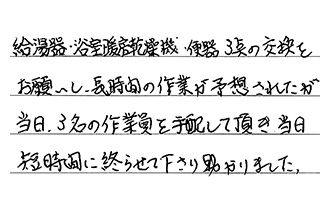 給湯器、浴室暖房乾燥機、便器、3点の交換をお願いし、長時間の作業が予想されたが、当日、3名の作業員を手配して頂き、当日短時間に終らせて下さり、助かりました。