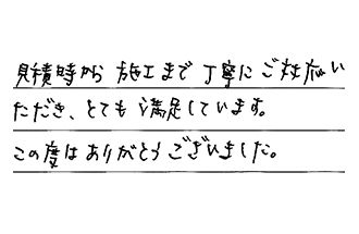 見積時から施工まで、丁寧にご対応いただき、とても満足しています。この度はありがとうございました。