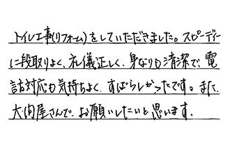 トイレ工事(リフォーム)をしていただきました。スピーディーに段取りよく、礼儀正しく、身なりも清潔で、電話対応も気持ちよく、すばらしかったです。また、大問屋さんで、お願いしたいと思います。