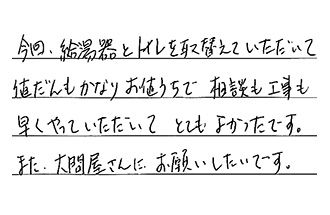 今回、給湯器とトイレを取替えていただいて、値だんもかなりお値うちで、相談も工事も早くやっていただいて、とてもよかったです。また、大問屋さんにお願いしたいです。