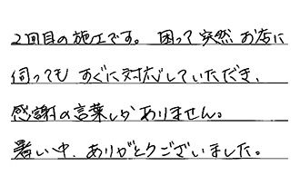 2回目の施工です。困って突然お店に伺っても、すぐに対応していただき、感謝の言葉しかありません。暑い中、ありがとうございました。