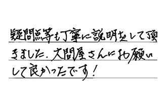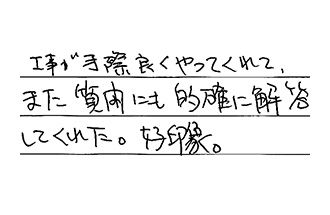 見積もりの日程も可能な限り早くして頂き、その場で見積金額を決めて頂きました。又、工事日も早目の日時で対応してもらい、大変良かったです。ありがとうございました。