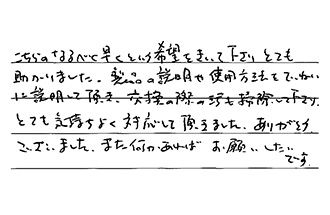 こちらのなるべく早くという希望をきいて下さり、とても助かりました。製品の説明や使用方法を、ていねいに説明して頂き、交換の際の汚れも掃除して下さり、とても気持ちよく対応して頂きました。ありがとうございました。また何かあれば、お願いしたいです。