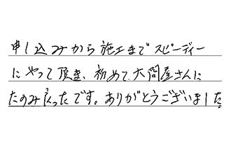 申し込みから施工まで、スピーディーにやって頂き、初めて大問屋さんにたのみ、良かったです。ありがとうございました。