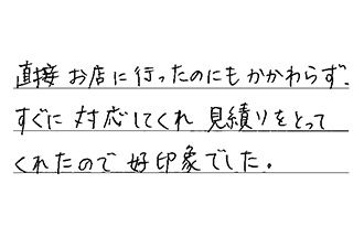 直接お店に行ったのにもかかわらず、すぐに対応してくれ、見積りをとってくれたので、好印象でした。
