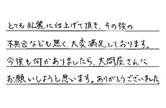 とても綺麗に仕上げて頂き、その後の不具合なども無く、大変満足しております。今後も何かありましたら、大問屋さんにお願いしようと思います。ありがとうございました。