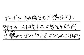 サービス・価格ともに満足です。施工の一人体制は大変そうですが、丁寧かつコンパクトで、マンションにはよい。