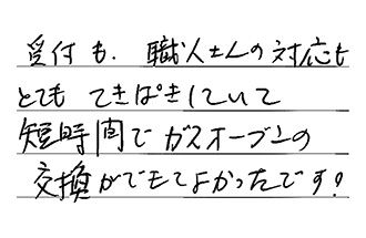受付も、職人さんの対応も、とてもてきぱきしていて、短時間でガスオーブンの交換ができて、よかったです!